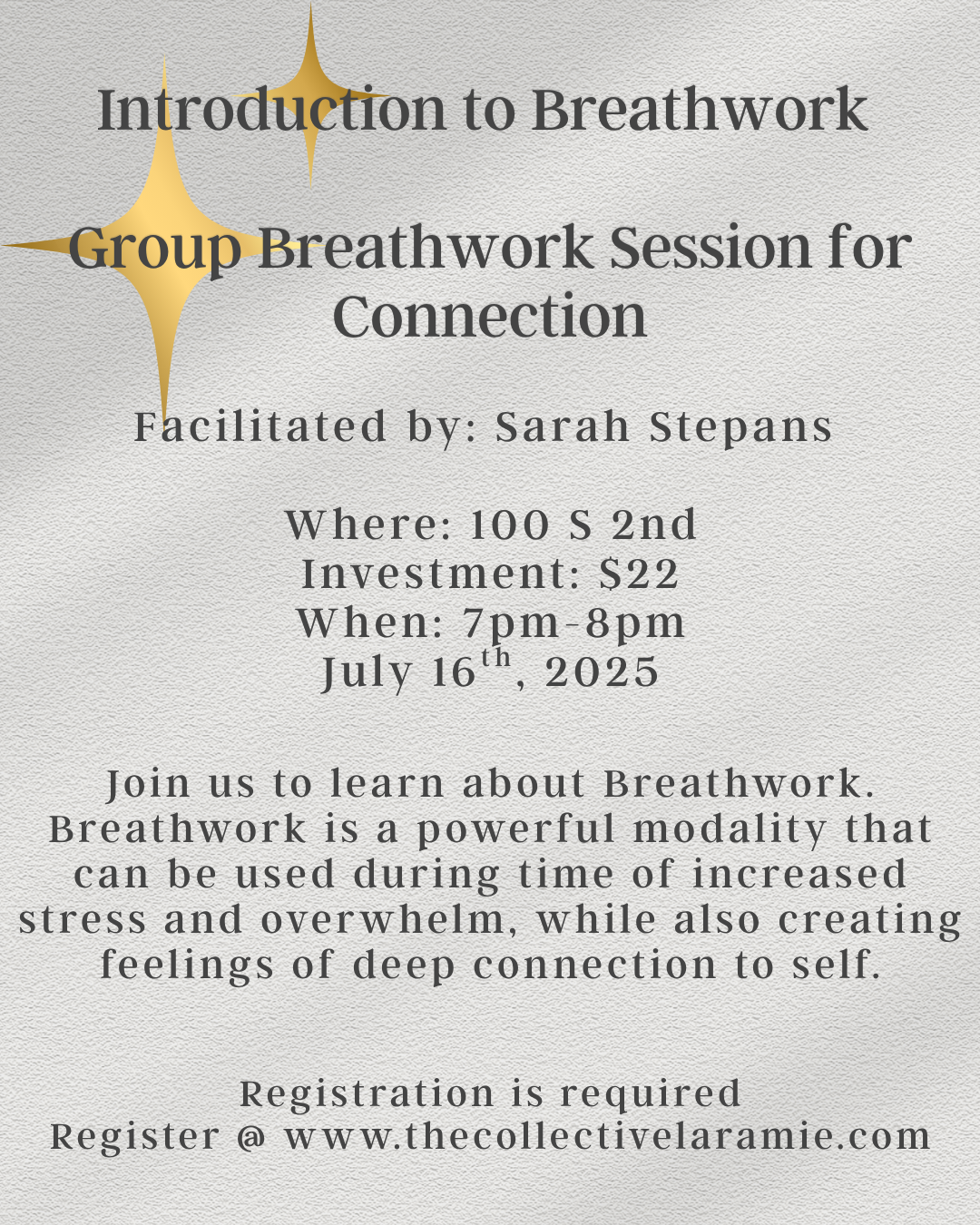 Please join us on Wednesday July 16th from 7pm-8pm for Introduction to Breathwork Group Breathwork for Connection at The Collective: Center for The Healing Arts @ 100 S 2nd Laramie WY.